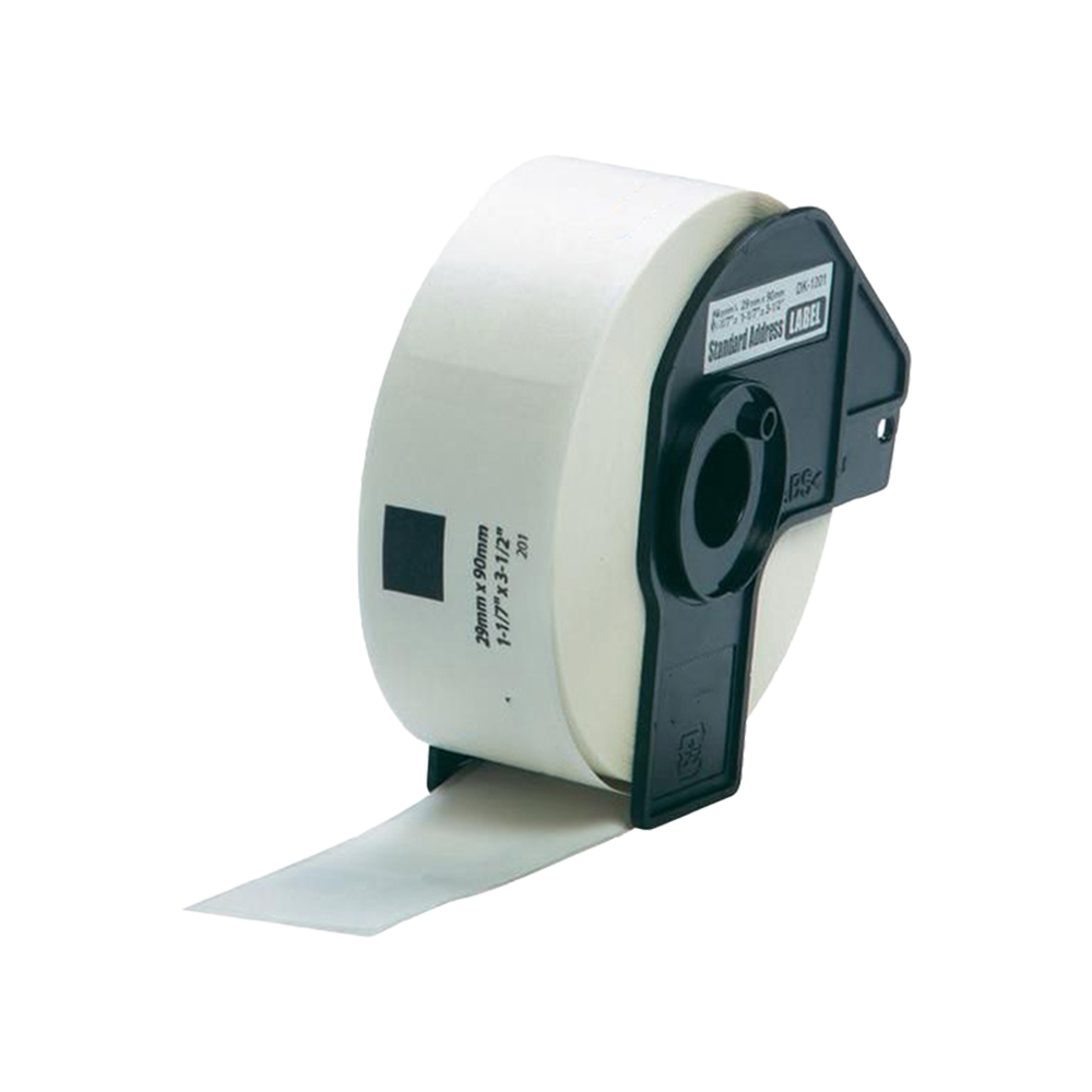 Лента с етикети DK-11201 с черен текст на бял фон е подходяща за широк кръг приложения за етикетиране. За употреба както в домашна, така и в офис среда, тези стандартни адресни етикети могат да се използват за отпечатване на лога, баркодове, посетителски баджове или етикети с информация за доставка.