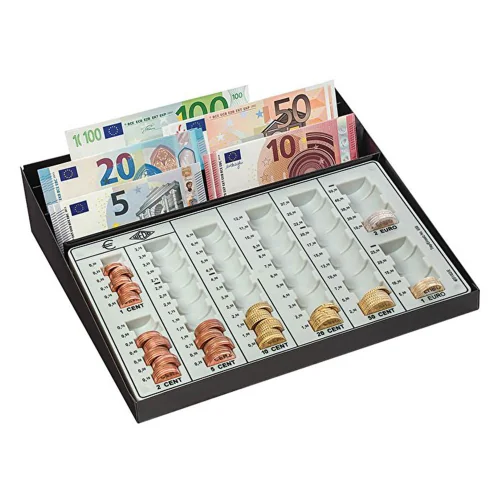 Светлосива поставка за монети със скали за номинали за лесно отчитане на паричния баланс.