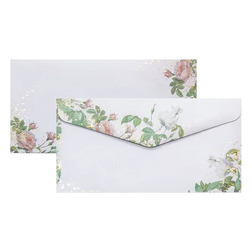 Елегантен плик за кореспонденция и поздравителни картички. С лепило, активиращо се чрез навлажняване. Размер: DL (110 х 220 мм) Дизайн с флорални десени. Плътност: 120 g/m2 Опаковка: 10 броя