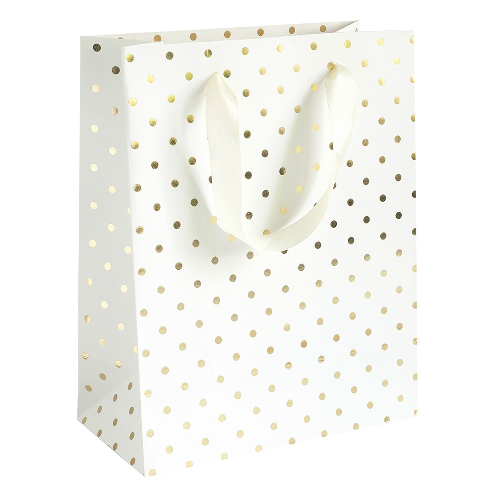 Елегантни крафт торбички за подаръци със златни точки. Размер: 20x8x15 см Материал: бяла хартия Опаковка: 5 броя