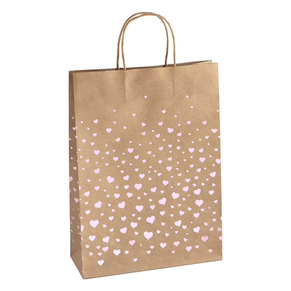 Елегантни крафт торбички за подаръци с розови сърца. Размер: 33x10x24 см Материал: крафт хартия Опаковка: 5 броя