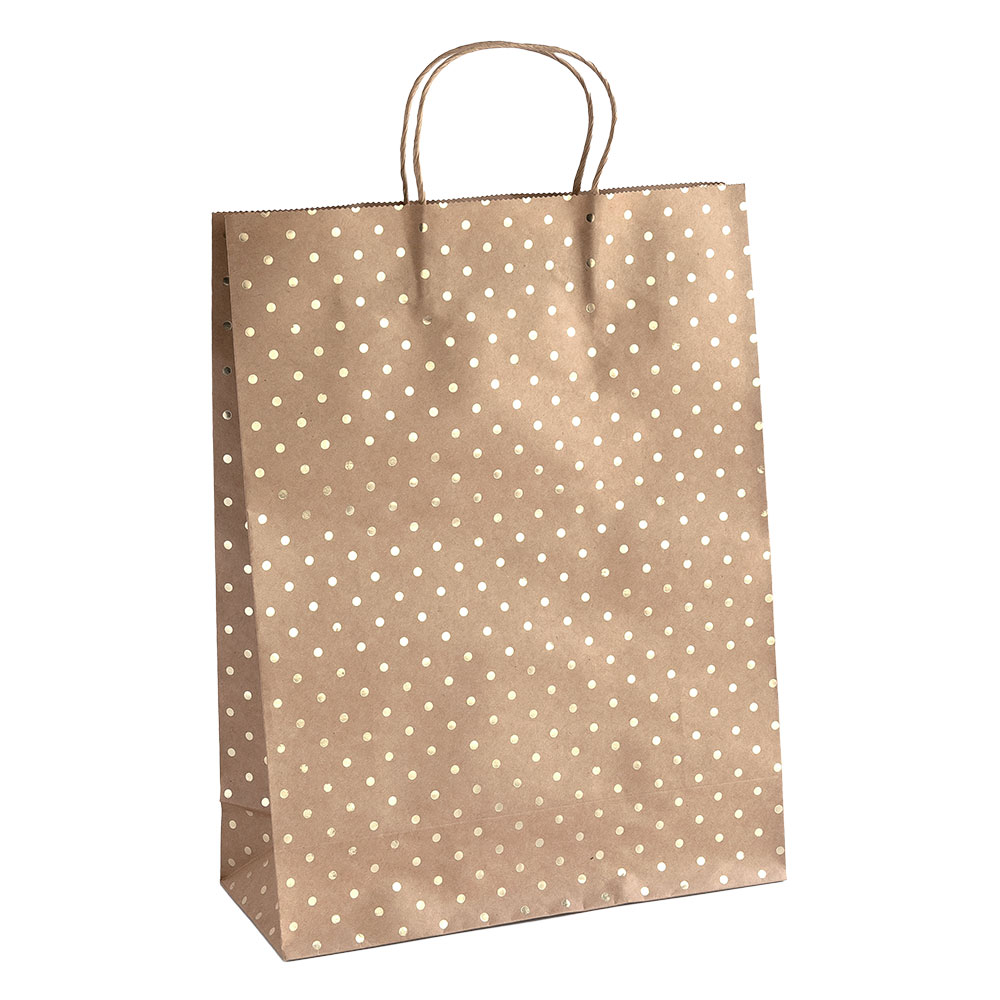 Елегантни крафт торбички за подаръци със златни точки. Размер: 39x12x30 см Материал: крафт хартия Опаковка: 5 броя