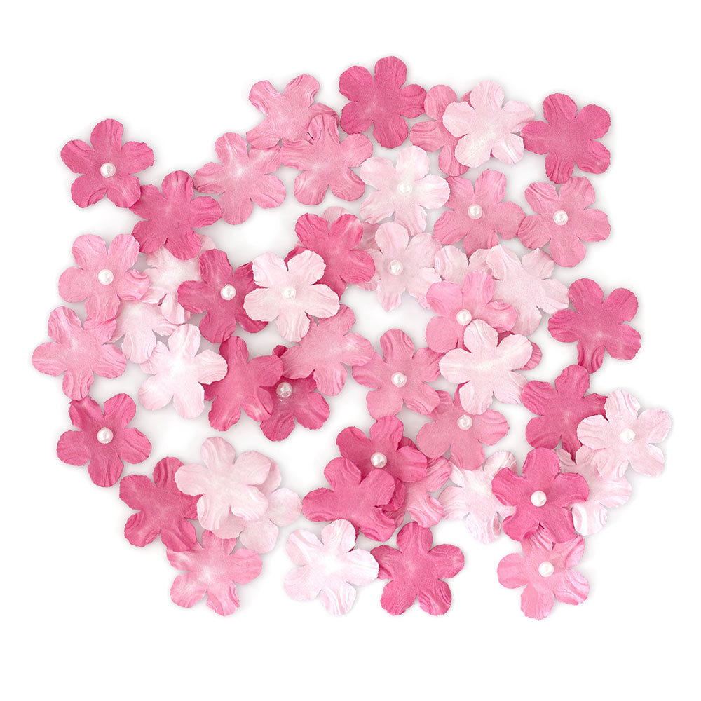Хартиени цветя Незабравки с перли. Подходящи за декорация на картички, подаръчни кутии и торбички, сватбена украса и други креативни проекти. Материал: хартия. Цвят: розов Опаковка: 50 броя (25 броя с перла и 25 броя без перла)