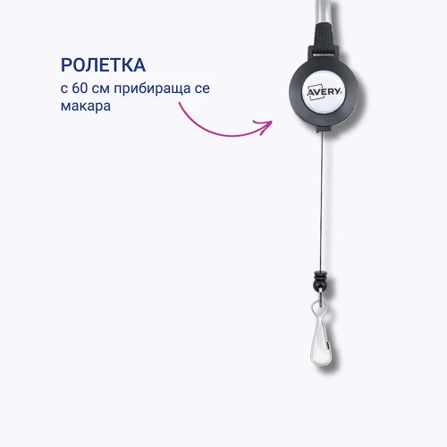 - Практичен "йо-йо" механизъм: Вградената ролетка позволява издърпване на баджа на разстояние до 60 см. Така сканирате картата си бързо и лесно, без да се налага да я сваляте от врата или да се навеждате към четеца.