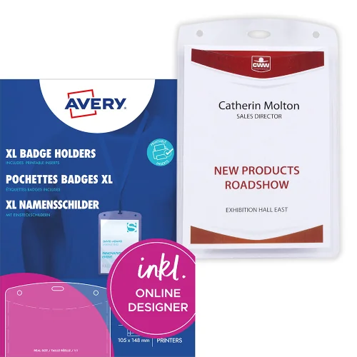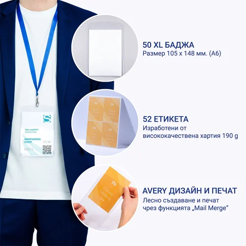 Комплект баджове Avery 4834XL който съчетава PVC бадж, връзка и вложка с формат А6.