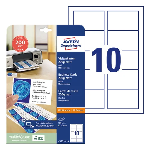 Създайте своите професионални визитки бързо и лесно с безплатния софтуер на Avery Zweckform. Изберете от богата галерия с готови шаблони или качете собствен дизайн – всичко, което трябва да направите след това, е просто да ги разпечатате.