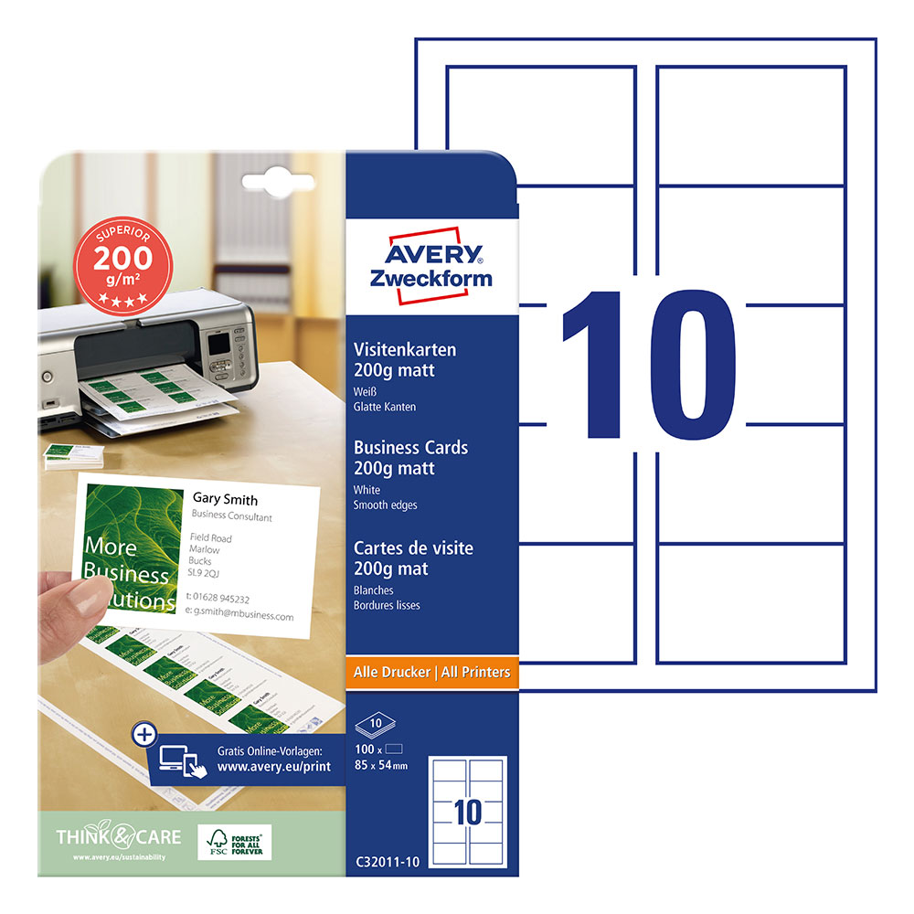 Създайте своите професионални визитки бързо и лесно с безплатния софтуер на Avery Zweckform. Изберете от богата галерия с готови шаблони или качете собствен дизайн - всичко, което трябва да направите след това, е просто да ги разпечатате.