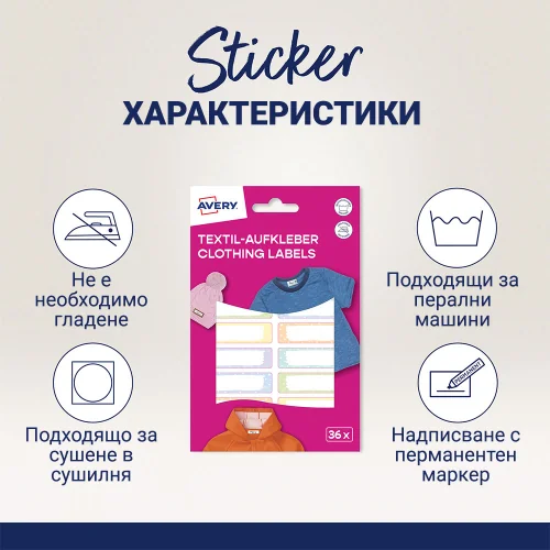 Без гладене и без шиене - просто надпишете името, отлепете и залепете върху етикета на дрехата.