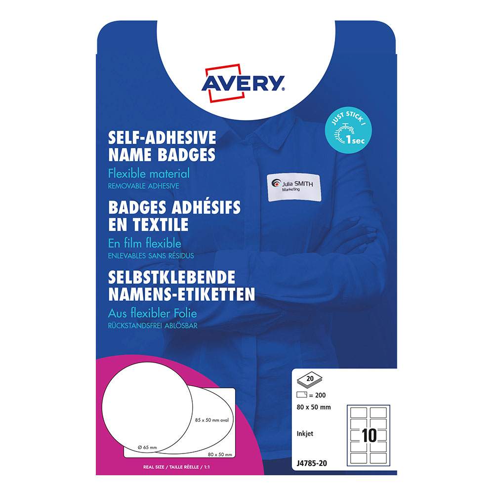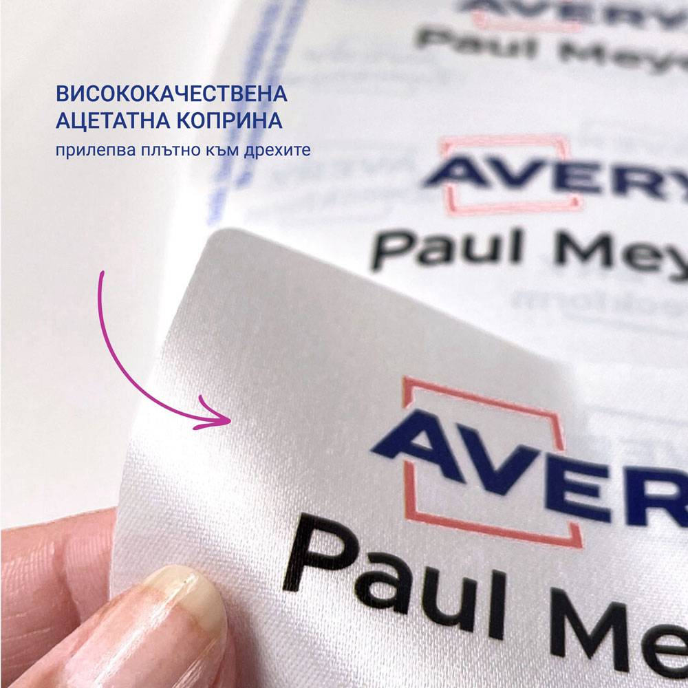 Текстилни самозалепващи бадж-етикети Avery J4785-20 за мастиленоструйни принтери.