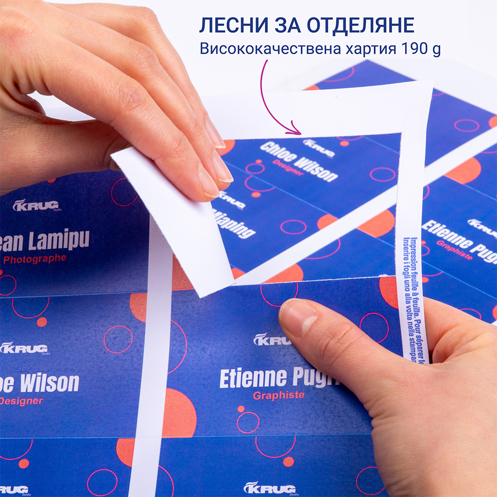 - Висококачествен картон: Плътността от 190 g/m² придава на баджовете здравина и професионално усещане, като същевременно осигурява ясен печат без размазване.