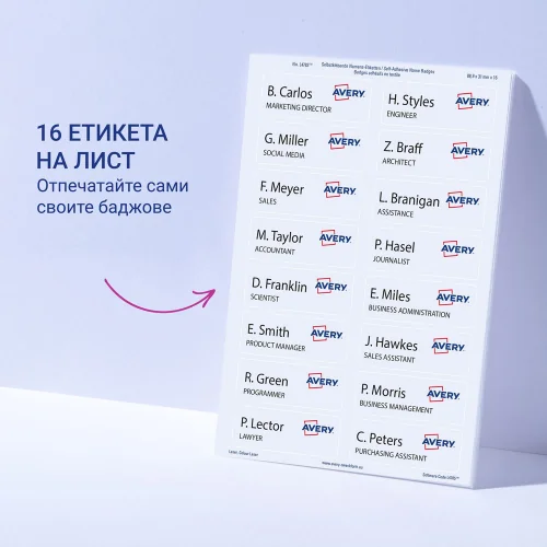 Текстилни самозалепващи бадж-етикети Avery L4783-20 за лазерни принтери.