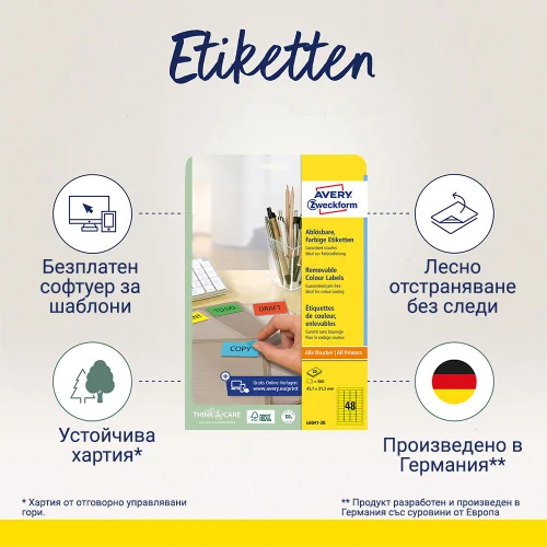 | Етикети в опаковка | 960 броя (48 етикета на лист) |