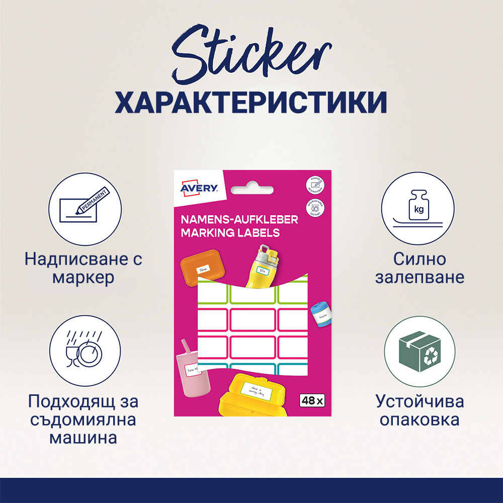 Забравете за изгубените бутилки и разменените кутии за обяд! С водоустойчивите стикери на Avery Zweckform вещите на вашето дете ще се прибират вкъщи всеки ден. Тези етикети от специално фолио са създадени да издържат на всичко – от разливане на сок до ежедневно миене в съдомиялна машина. Идеални за детската градина, училището или спортната зала.