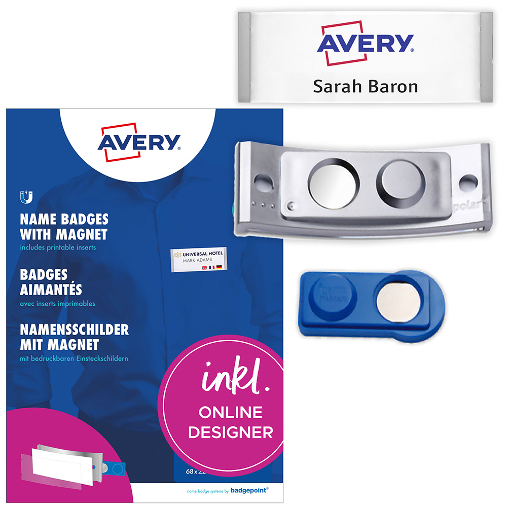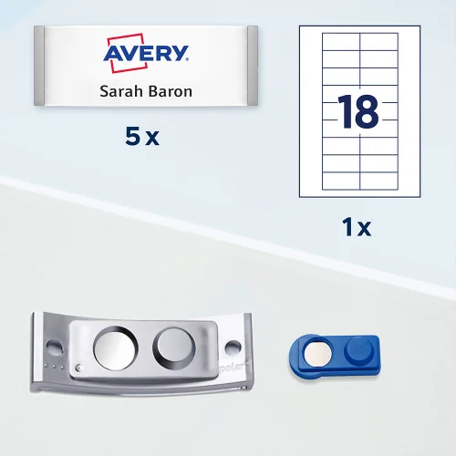 - Лесна персонализация и гъвкавост: Прозрачният прозорец позволява светкавична подмяна на имената, което прави баджовете изключително икономични при текучество на персонал или промяна на събитията. Използвайте безплатните шаблони в Microsoft® Word или онлайн софтуера на Avery, за да създадете перфектен дизайн само за няколко минути.