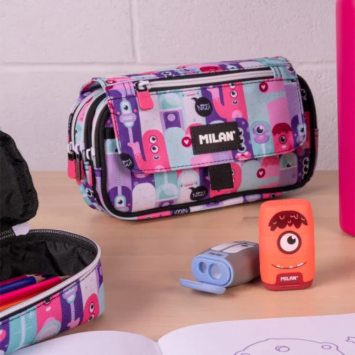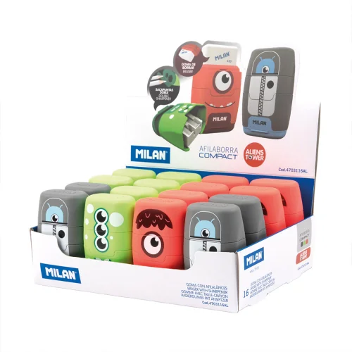 Приготви се за излитане! Серията Aliens на Milan превръща всяка грешка в забавно откритие. Този модел Compact е твоята станция за подготовка – разполага с голяма и мека гума за „заличаване“ на космически грешки и мощна острилка с резервоар за твоите моливи. С веселите илюстрации на извънземни приятели, училището става много по-забавно!