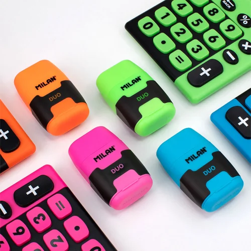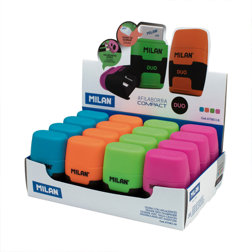 Имаш тънки графитни моливи за писане и дебели цветни моливи за рисуване? Milan Compact Duo е създаден точно за теб! Този модел разполага с две острилки с различен размер и голяма мека гума, събрани в един изключително удобен корпус. Вече няма нужда да носиш няколко инструмента – всичко важно е в твоята "Duo" станция.