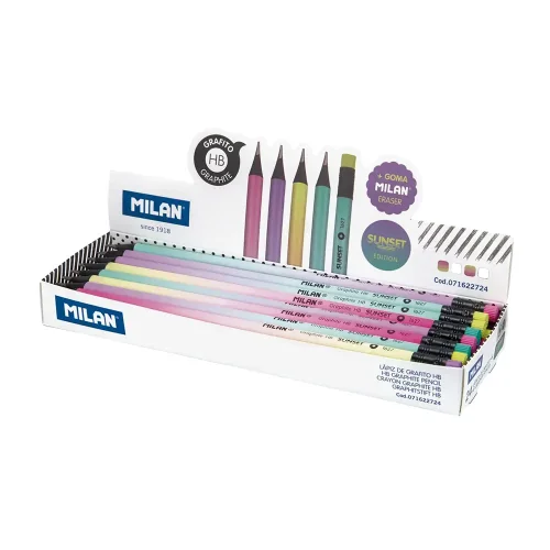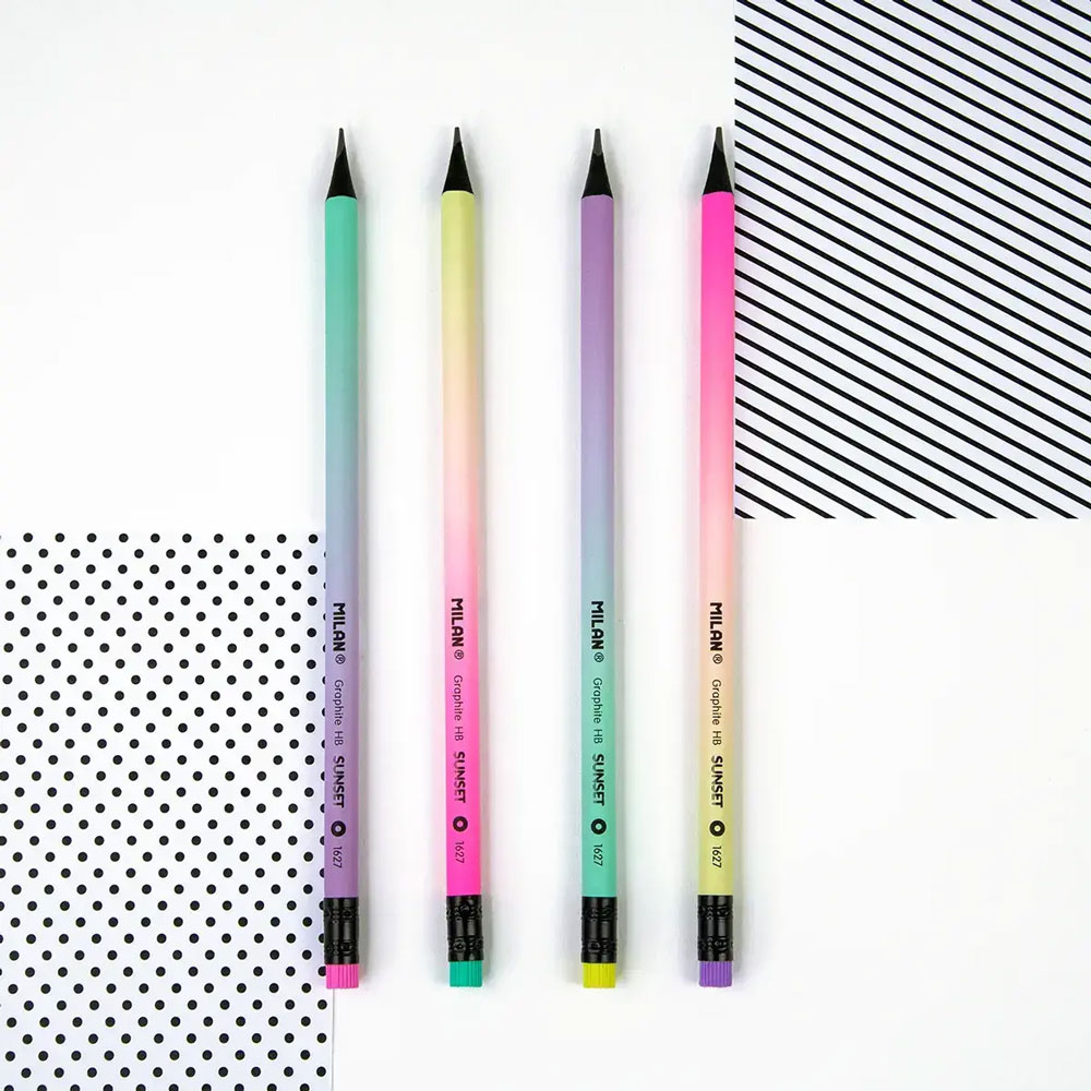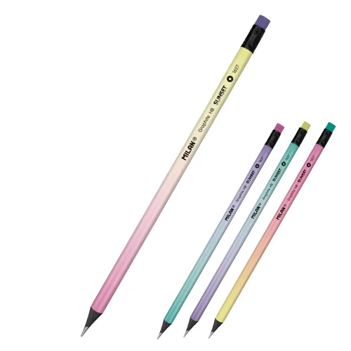 Подобрете преживяването си при писане и рисуване с висококачествения черен графитен молив на испанската марка Milan Sunset с твърдост HB и гумичка. Съчетава доказаното качество с модерна визия в пастелни нюанси.