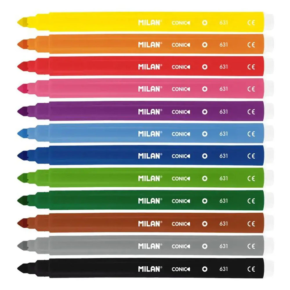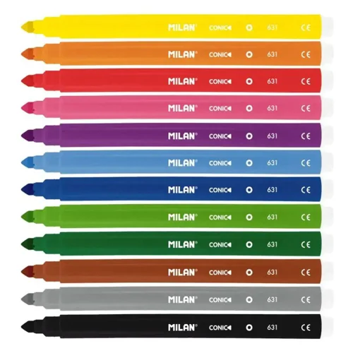 Открийте магията на рисуването с флумастерите на Milan! Благодарение на своя специален коничен връх, тези флумастери са истинско "2 в 1" решение. Детето може да използва върха за изключително фини линии и контури, или да наклони флумастера, за да запълни големи площи с дебел и плътен цвят.