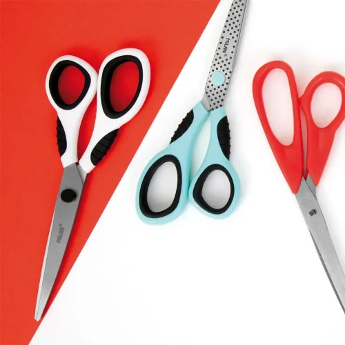 - Универсалност: Дължината на ножицата предлага оптимален баланс между контрол и сила на рязане – подходяща за хартия, картон, текстил и фолио.