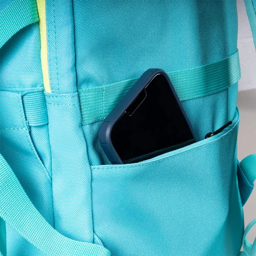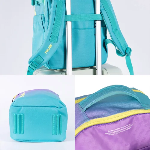 Внесете енергия, стил и готовност за всяко предизвикателство в учебния ден с раница от колекцията Sunset на Milan! Със своя уникален преливащ се дизайн в тюркоазено и жълто, вдъхновен от цветовете на залеза, тя е идеалният аксесоар за тези, които търсят модерен и свеж вид. Моделът предлага допълнително пето отделение, което го прави лидер в организирането на ученическите принадлежности.