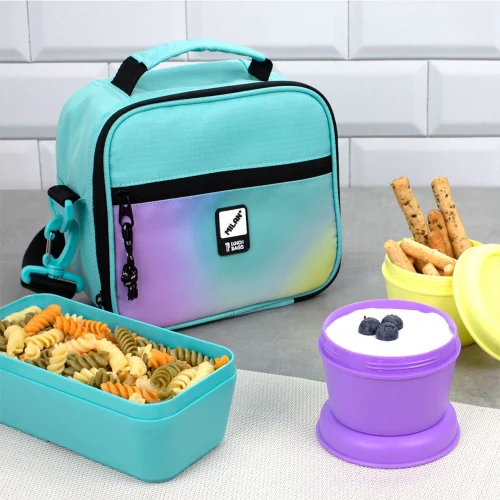 Тази изотермична чанта в преливащо тюркоазено не само изглежда невероятно, но е и супер функционална. Тя идва с 3 включени кутии за храна, които пасват точно вътре, за да не губиш място. Идеална е за училище, за плажа или за излет в планината.