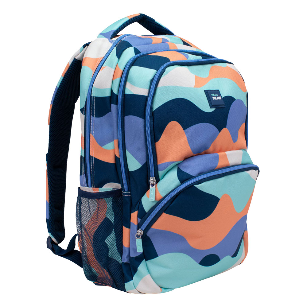 Със своите смели контрасти между кралско синьо, наситено оранжево и светли тонове, тя превръща всеки учебен ден в приключение. С голям капацитет от 25 литра и отлично разпределение, раницата осигурява комфорт и ред през целия ден.