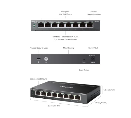 | PoE характеристики | 8 PoE+ порта PoE бюджет: 64W общо, до 30W на порт Remote Camera Reboot До 250 m PoE дистанция |