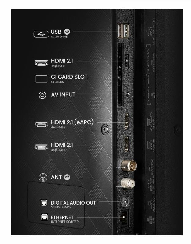 | Изводи за свързване | 3 HDMI, 2 USB, S/PDIF out, CI+ Slot, Composite (AV) in, 2 RF In, Audio (L/R) in, Headphone out |