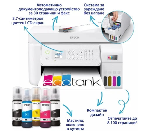 Спестете·до·90%·от·разходите·за·печат*·с принтерите EcoTank без касети на Epson. Интегрираните резервоари за мастило се пълнят лесно благодарение на специално проектираните бутилки с мастило с голям обем, които са включени в комплекта. Без касети за смяна и с гъвкави функции за свързване, това е идеалният принтер за всеки, който се нуждае от висококачествени разпечатки с невероятно ниска цена на страница.
