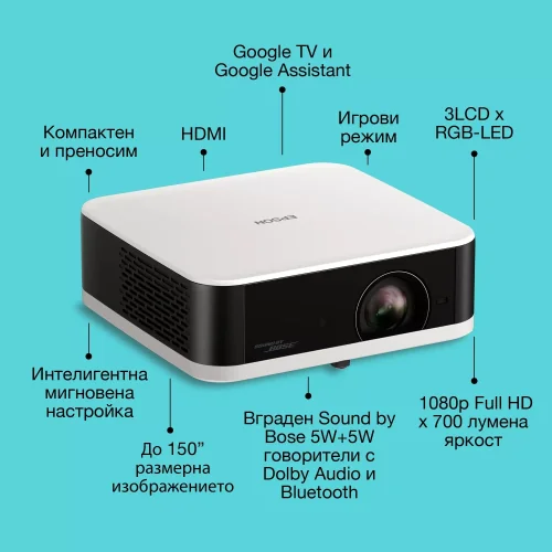 Преносим smart проектор, Sound by Bose, Google TV, Full HD, 700 лумена, 3LCD x RGB-LED, настройка без усилие, употреба на закрито и на открито. Насладете се на наистина завладяващи моменти с преносимите smart проектори Epson Lifestudio.