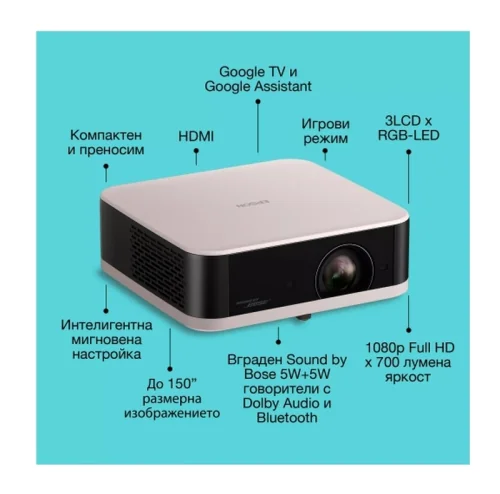 Разгледайте новата гама преносими проектори Lifestudio от Epson. С триядрения двигател от Epson, Sound by Bose, с Google TV и лесна настройка са идеални за стилни, свързани забавления. Гамата Epson Lifestudio е проектирана така, че да се вписва безпроблемно в живота Ви и в пространството Ви. Тези преносими проектори „всичко в едно“ вдъхват живот на любимите Ви филми, шоута и игри с ярки цветове, отчетливи детайли и завладяващ звук.