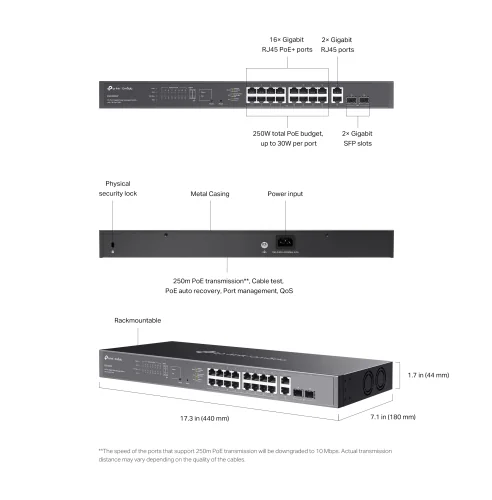 - 20× гигабитови порта (16× PoE+ RJ45, 2× RJ45, 2× SFP)
