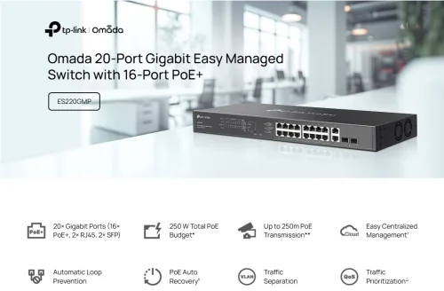 20-портов комутатор TP-Link Omada ES220GMP Gigabit Easy Managed Switch с 16 PoE+ порта