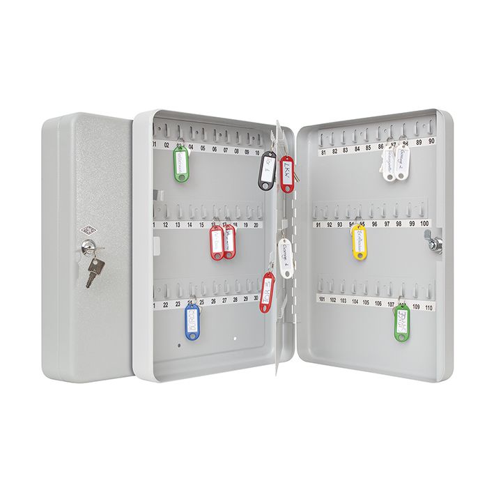 Metal key board. Lock with 2 keys. Holes on the back for wall mounting. 1 mm thick steel construction. Capacity 110 keys.