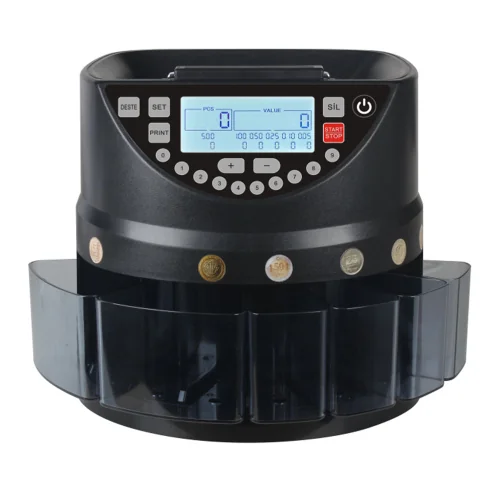 This coin counting machine is optimized for handling Euro coins, providing reliable and precise counting at speeds of up to 270 coins per minute.
