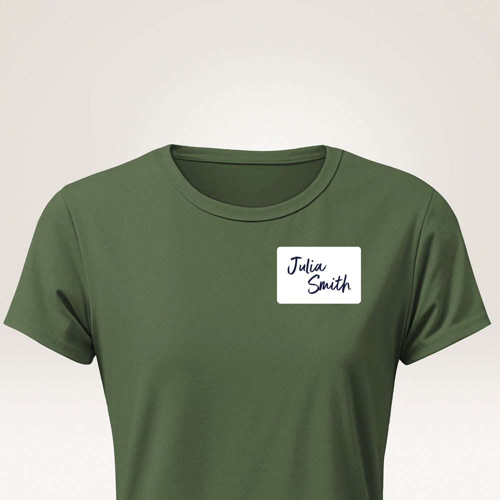 Make a memorable first impression with professional silk acetate name labels. Thanks to their flexible textile structure, they adhere perfectly to clothing and follow every movement without coming loose at the edges. The specially developed adhesive guarantees a secure attachment to textiles, while allowing for easy removal at the end of the day, without leaving marks or damaging the fine threads of clothing.