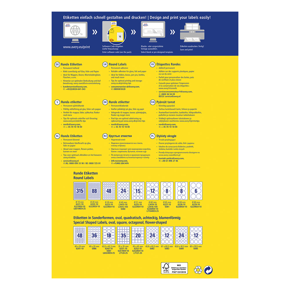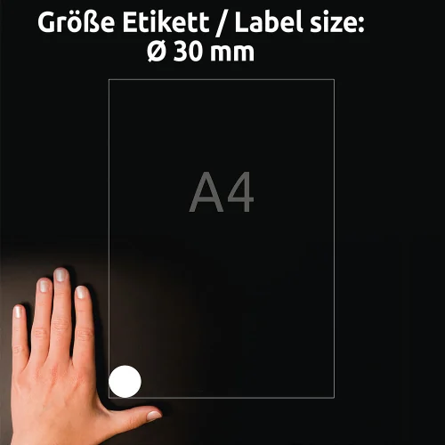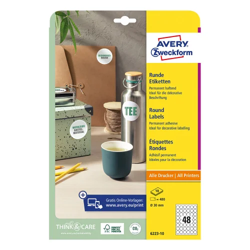 Give a finished and professional look to your products, packaging or corporate materials with Avery round labels. With a diameter of 30 mm, they are ideal for logos, advertising messages or for sealing envelopes and gift bags.