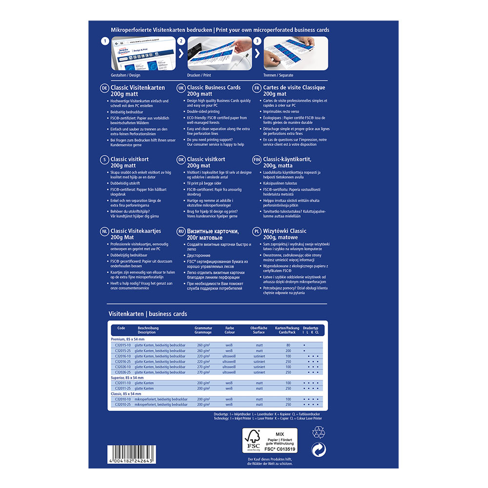 - Perfect finish: Thanks to the fine microperforation, the business cards are easily separated and have perfectly smooth edges, indistinguishable from those made in a printing house.