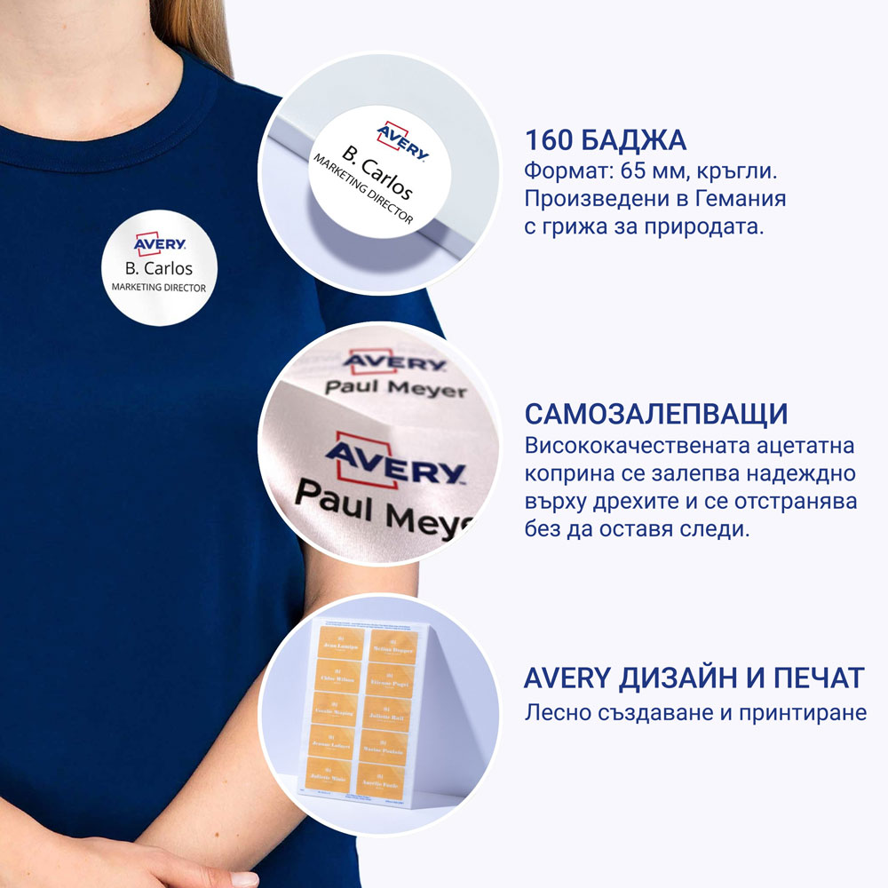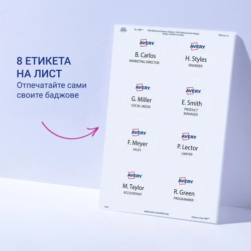 Avery L4881-20 self-adhesive textile badge labels in a circle shape for laser printers.