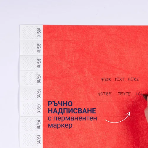 Unlike printable sheet options, these are ready-made red Tyvek® wristbands, supplied on fan-shaped strips, designed for hand-lettering or direct use.
