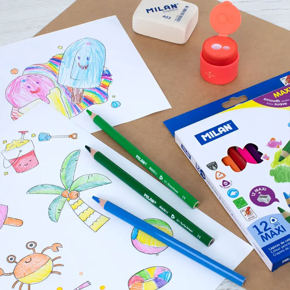The set of 12 colored pencils from the MAXI series by Milan with a sharpener included is specially designed for the youngest artists who are still developing their motor skills and creative skills.