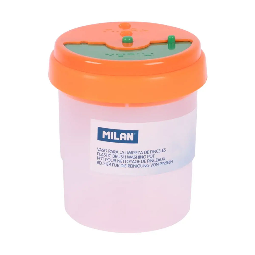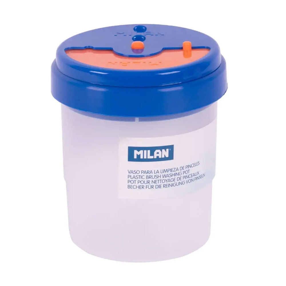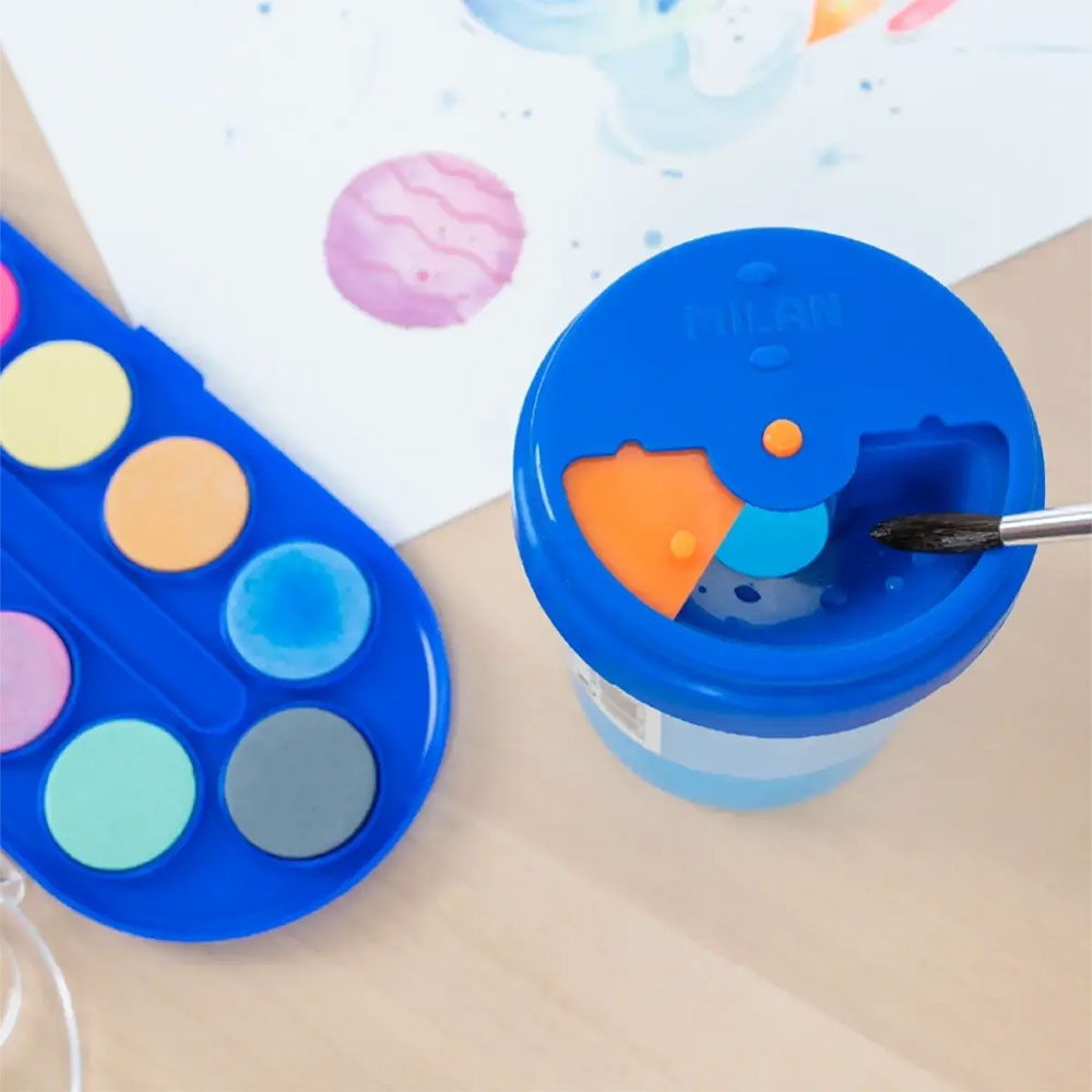 Drawing with crayons is fun until the cup of water tips over onto your masterpiece. With this special cup from Milan, that's no longer a problem! It's designed with a special lid that prevents spills, and has convenient grooves to place your brushes on so they don't get on your desk.