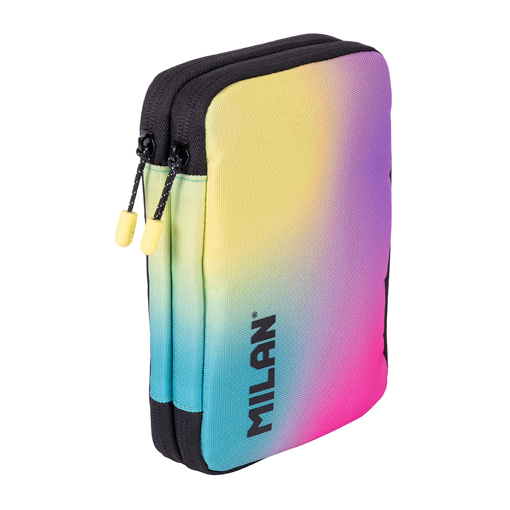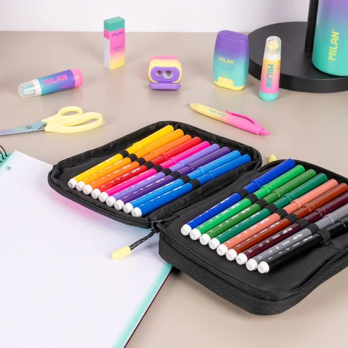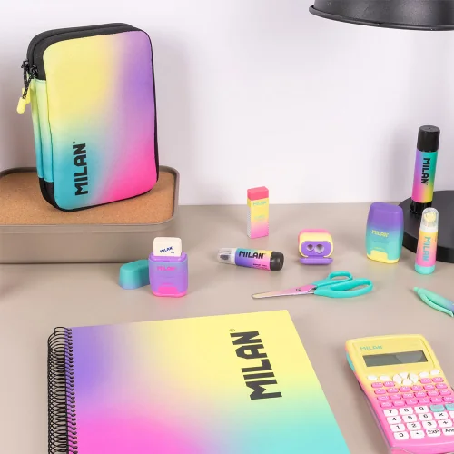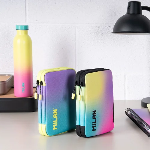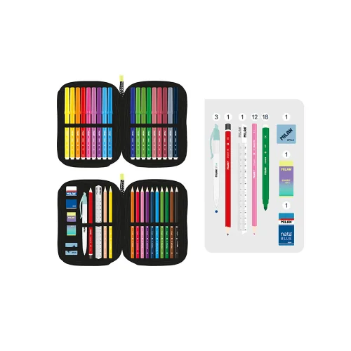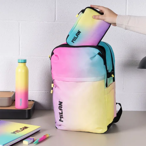 Organize the school day with impeccable style and quality with a complete set from Milan's Sunset collection! This model in elegant black with delicate iridescent shades is the ideal solution for students who value both aesthetics and practicality. Compact yet extremely functional, it comes fully equipped with high-quality Milan supplies, ready to use from day one.