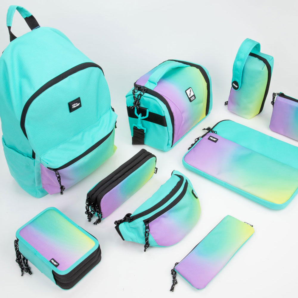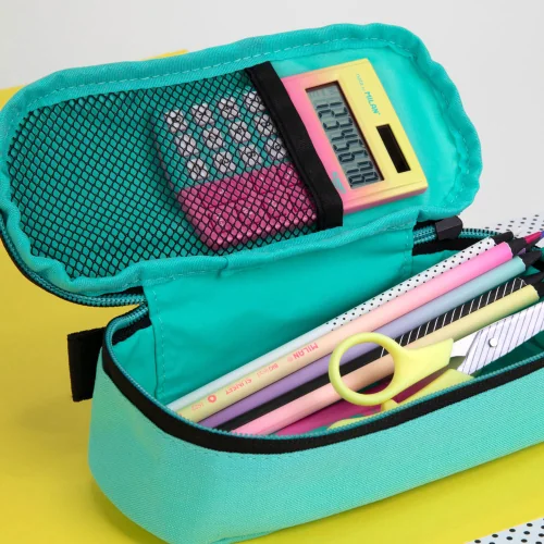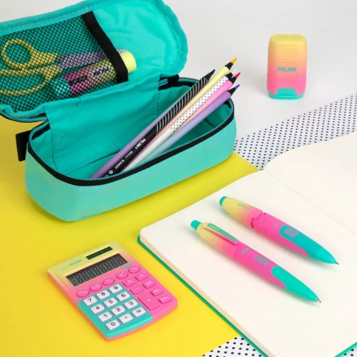 Add color and a modern look to your school day with the oval pencil case from Milan's Sunset collection! Inspired by the iridescent shades of the summer sky, this model in turquoise and pink tones combines large capacity with a compact and convenient shape. It is designed to store all the important tools in one place, providing easy access to them.