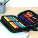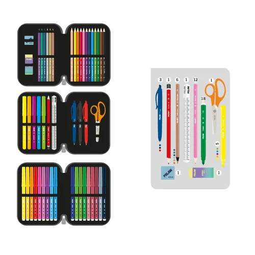 (18 felt-tip pens, 18 colored pencils, 1 HB pencil, 3 pens, 1 ruler, 1 sharpener, 1 eraser, 1 scissors, 5 markers)