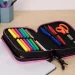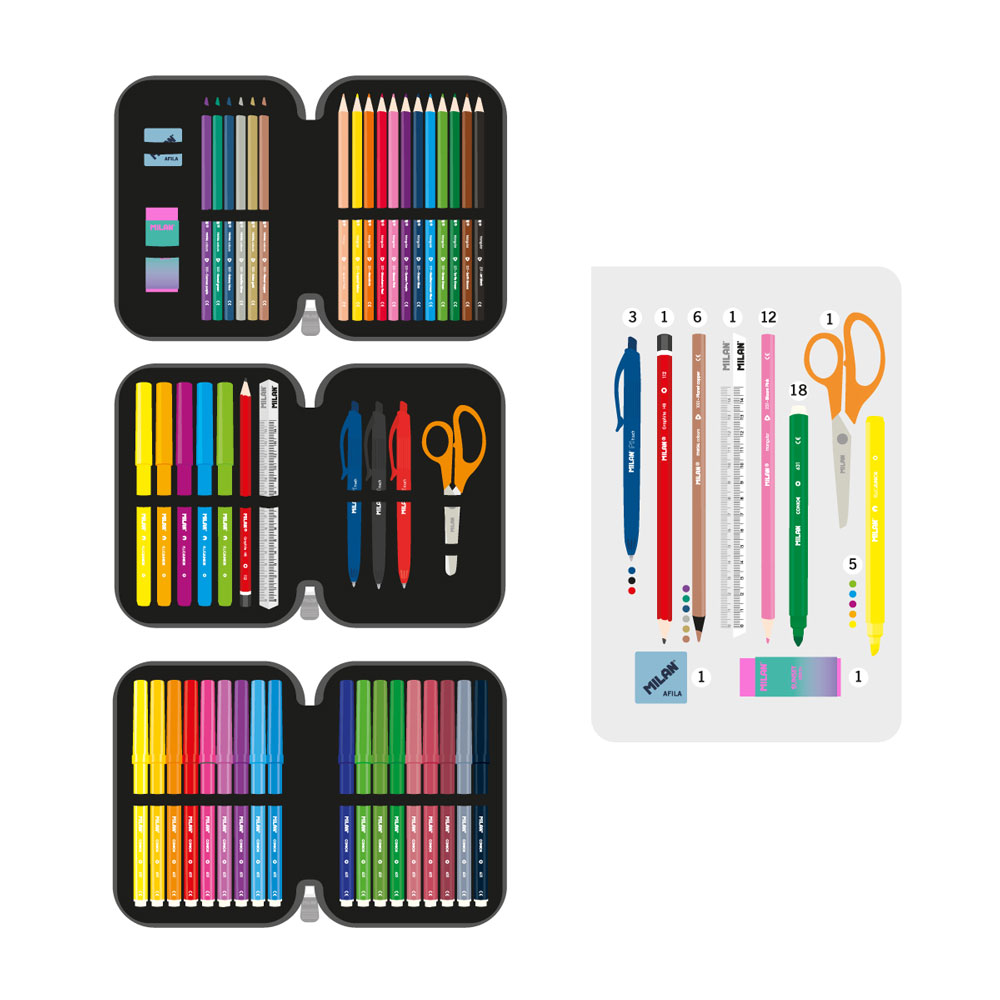 (18 felt-tip pens, 18 colored pencils, 1 HB pencil, 3 pens, 1 ruler, 1 sharpener, 1 eraser, 1 scissors, 5 markers)