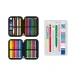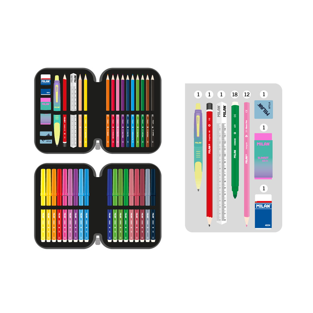 (18 felt-tip pens, 12 colored pencils, 1 HB pencil, 1 ballpoint pen, 1 ruler, 1 sharpener, 2 erasers)