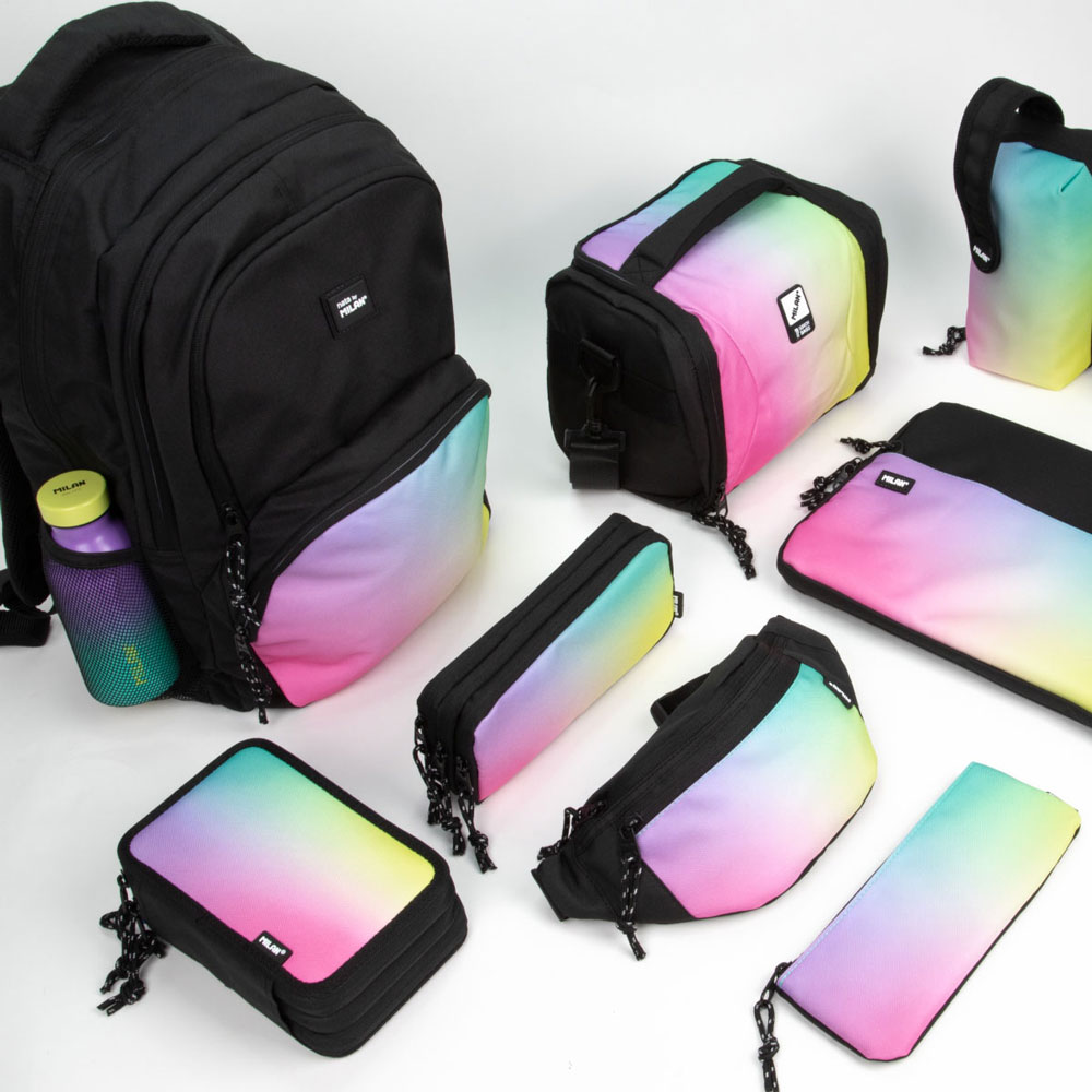 Organize your school day with impeccable style and quality with a complete set from Milan's Sunset collection! This model in elegant black with delicate iridescent shades is the perfect solution for students who value both aesthetics and practicality.