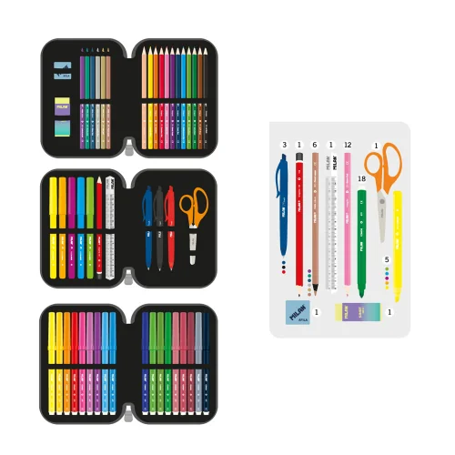 (18 felt-tip pens, 12 colored pencils, 10 graphite pencils, 3 pens (blue, black, red), ruler, scissors, 1 eraser 1 sharpener)