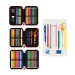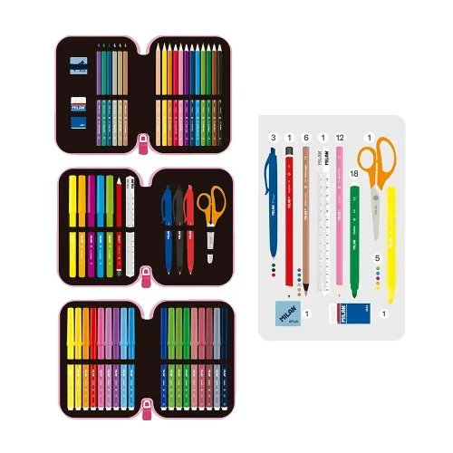 (18 felt-tip pens, 18 colored pencils, 1 HB pencil, 3 pens, 1 ruler, 1 sharpener, 1 eraser, 1 scissors, 5 markers)